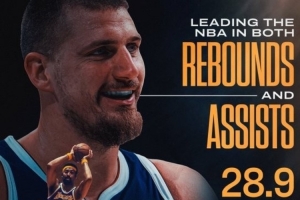 NBA官方配文:“NBA篮板王+助攻王,用‘历史性’都无法形容约基奇本赛季的表现🤯。”