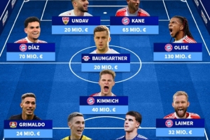 中场:路易斯·迪亚斯(拜仁)、基米希(拜仁)、鲍姆加特纳(莱比锡)、奥利塞(拜仁)